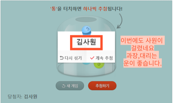 랜덤한 결과를 도출할수 있어 공정성까지 확보할수 있어서 1석2조의 효과를 기대할수 있습니다.