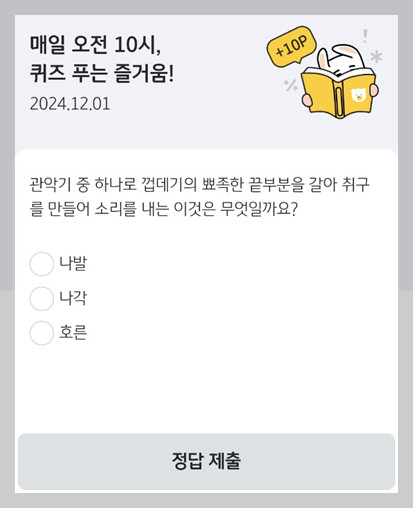 퀴즈는 하루에 한 번만 참여 가능하므로 신중히 답변을 선택해야 합니다.