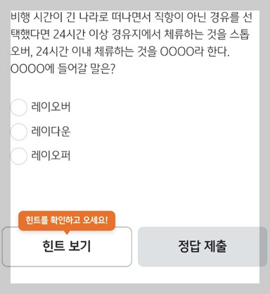 체류하는 것을 스톱오버, 24시간 이내 체류하는 것을 OOOO라 한다. OOOO에 들어갈 말은?"