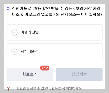 Q. "신한카드로 25%할인 받을수 있는 <빛의 거장 카라바조 & 바로크의 얼굴들>