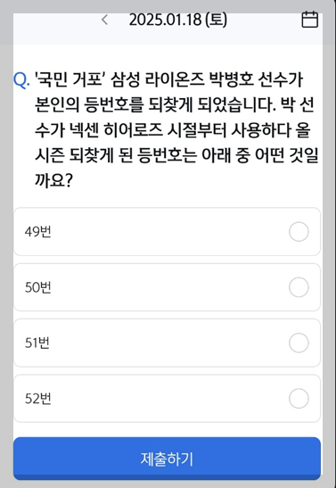 Q. "'국민 거포' 삼성 라이온즈 박병호 선수가 본인의 등번호를 되찾게