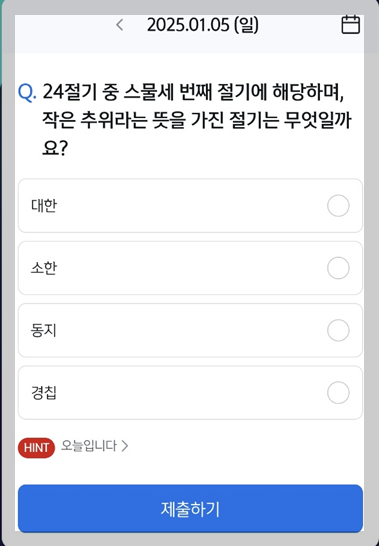 Q. "24절기 중 스물세 번재 절기에 해당하며, 작은 추위라는 뜻을 가진