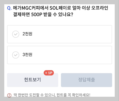 Q. "메가MGC커피에서 SOL페이로 얼마 이상 오프라인 결제하면 500P