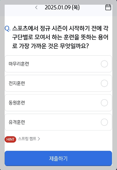 Q. "스포츠에서 정규 시즌이 시작하기 전에 각 구단별로 모여서 하는 훈련을