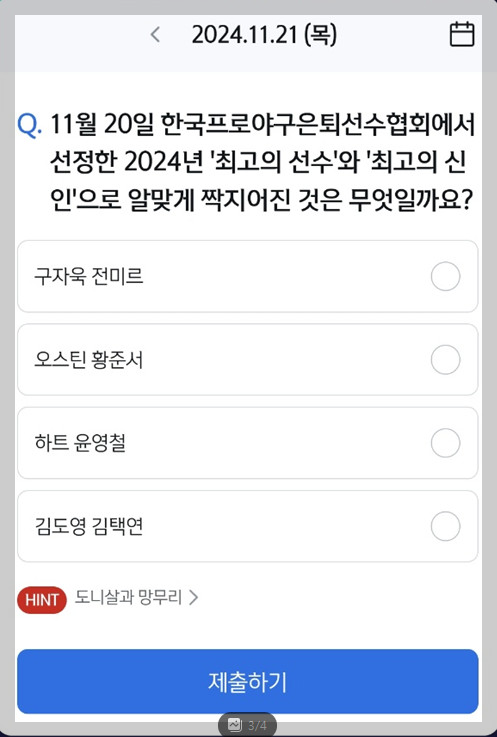 Q. "11월 20일 한국프로야구 은퇴선수협회에서 선정한