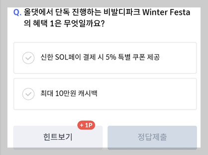 Q. "올댓에서 단독 진행하는 비발디파크 Winter Festa의 혜택 1은 무엇일까요?"