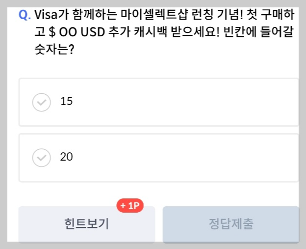 Q. "Visa가 함께하는 망셀렉트샵 런칭 기념! 첫 구매하고 $ OO USD 추가 캐시백 받으세요!