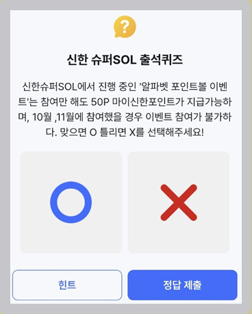 Q. "신한슈퍼SOL에서 진행 중인 '알파벳 포인트볼 이벤트'는 참여만 해도 50P 마이신한포인트가