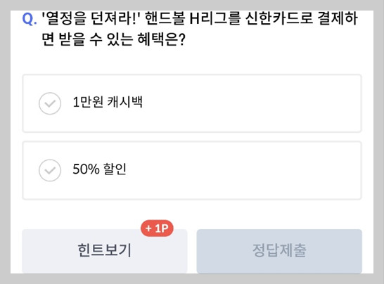 Q. "'열정을 던져라!' 핸드볼 H리그를 신한카드로 결제하면 받을 수 있는 혜택은?"