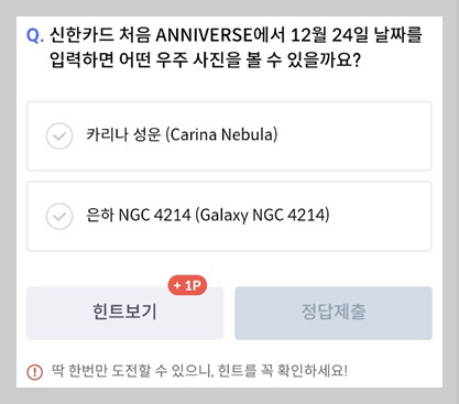 Q. "신한카드 처음 ANNIVERSE에서 12월 24일 날짜를 입력하면 어떤 우주 사진을