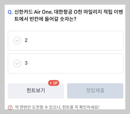 Q. "신한카드 Air One. 대한항공 O천 마일리지 적립 이벤트에서 빈칸에 들어갈 숫자는?"