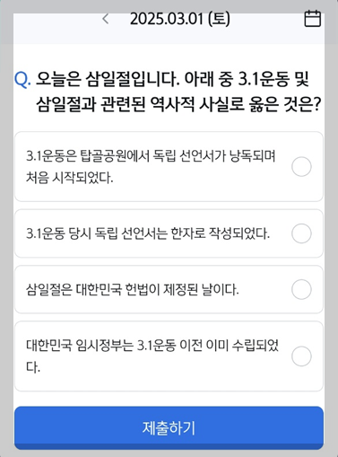Q. "오늘은 삼일절입니다. 아래 중 3.1운동 및 삼일절과 관련된