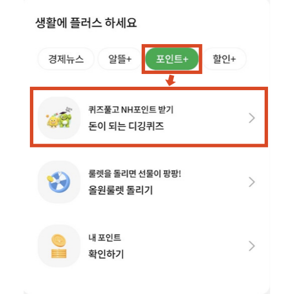 앱을 실행하면, 홈 화면 하단에 [포인트+]를 클릭하면 [돈이 되는 디깅퀴즈]를 찾을 수 있습니다.