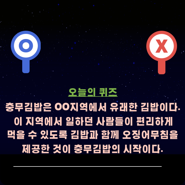 Q. "충무김밥은 OO지역에서 유래한 김밥이다. 이 지역에서 일하던 사람들이 편리하게