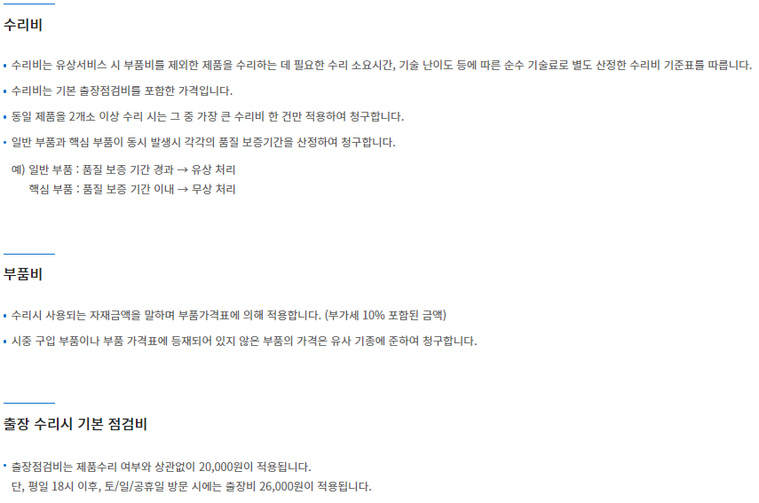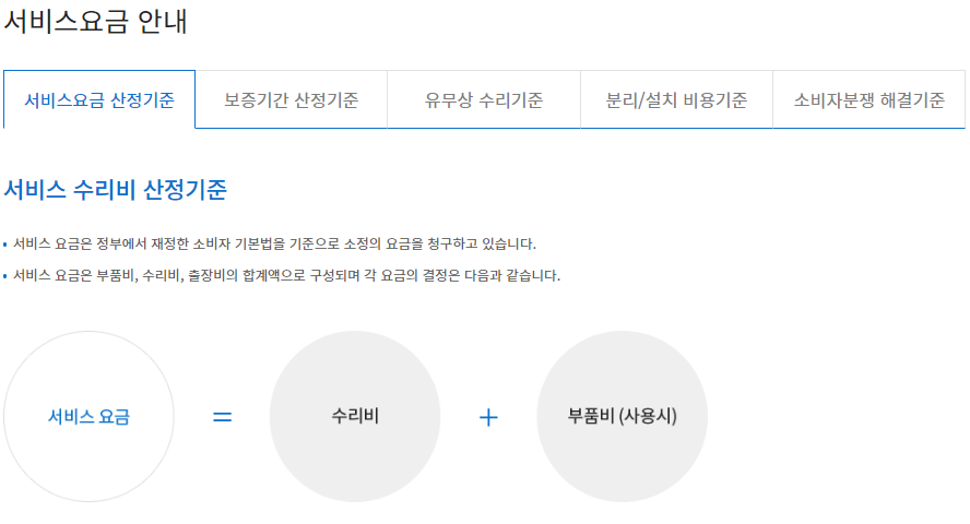 서비스 비용은 출장비, 부품 교체비, 수리비로 나뉩니다.
