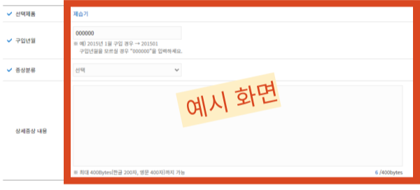 ▶선택제품 >> 구입년월 >>증상분류 >> 상세증상 내용을 기입