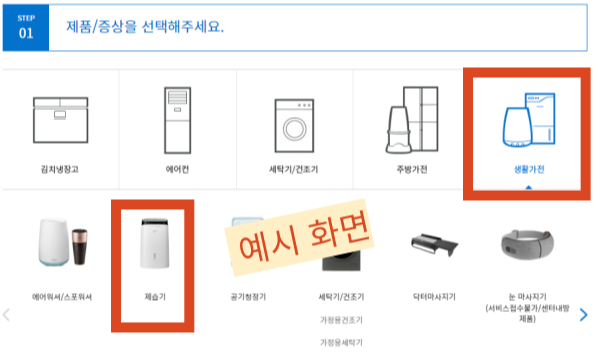 출장 서비스를 이용하기 위해서는 제품 모델을 찾아 선택하신 후,