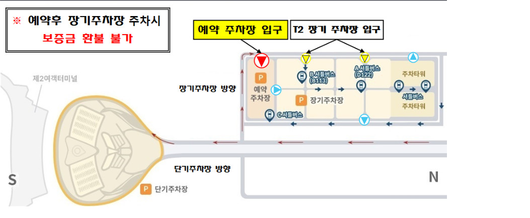 제2여객터미널 예약주차장과 장기주차장의 입구가 가깝기 때문에 혼동하기 쉽습니다.