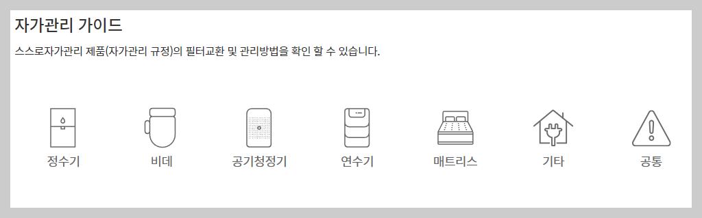 제품별 자가관리 가이드를 제공을 통해 제품의 필터교환 및 관리방법을 확인할 수 있습니다.
