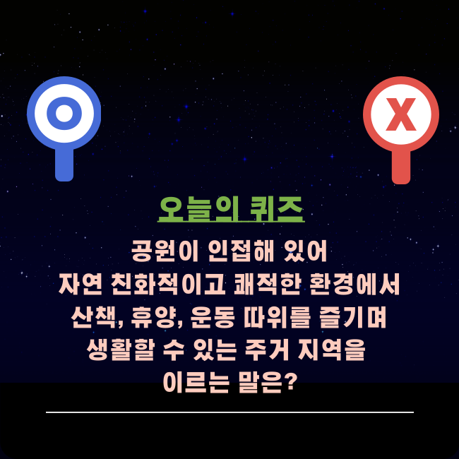 산책, 휴양, 운동 따위를 즐기며 생활할 수 있는 주거 지역을 이르는 말은?"