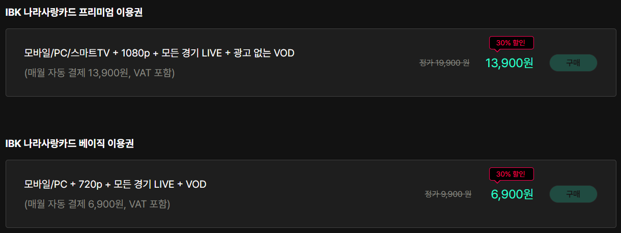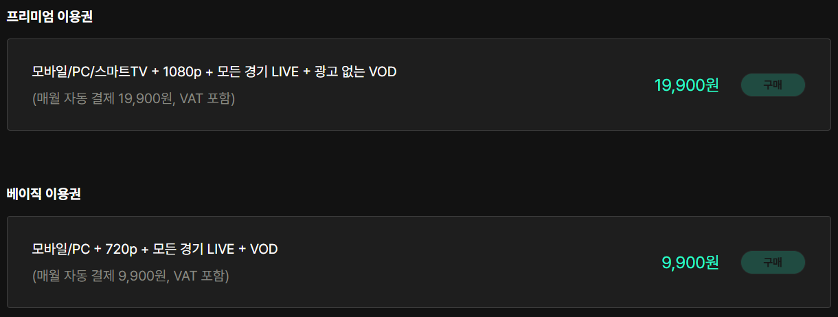 | 베이직 이용권 | 월 9,900원 | 720p 화질 + 모든 경기 LIVE + VOD |